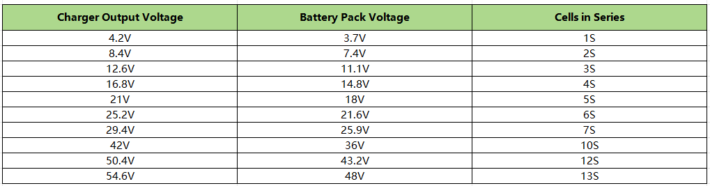 The output voltage of the charger must match the charging voltage of the battery pack. It should be equal to the fully charged voltage of the battery pack. For example, a single 18650 battery cell, its fully charged voltage is 4.2V, so the charger should output 4.2V. When there are 2pcs 18650 battery cells in series, the pack’s fully charged voltage is 8.4V (4.2V x 2), so you will need the charger’s output voltage to be 8.4V. Below is a chart for charger output voltage that is compatible with the battery pack voltages.