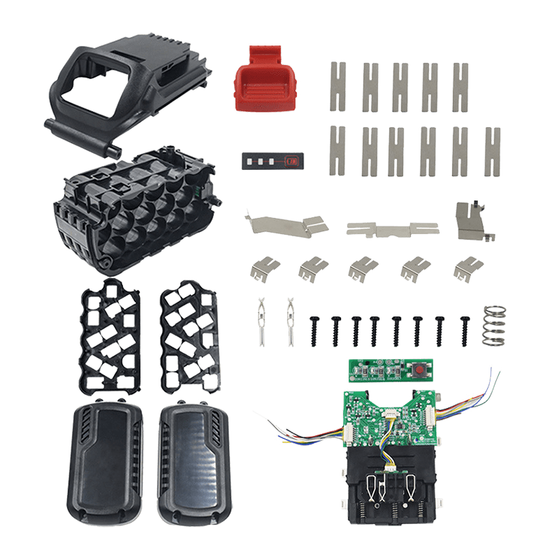 Replacement spare parts for Dewalt DCB609 Battery Pack, including outer battery box shell, BMS, battery holder, nickel strip, power indicator board, and sticker.