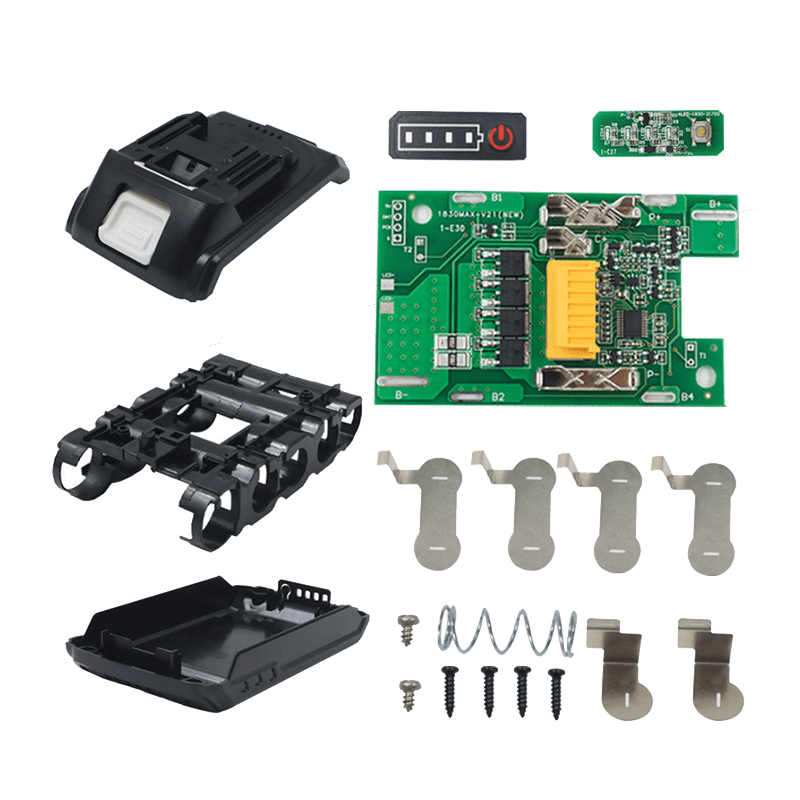 Replacement spare parts for Makita 21700 3.0AH 18V Battery Pack, including outer battery box shell, BMS, battery holder, nickel strip, power indicator board, and screws.