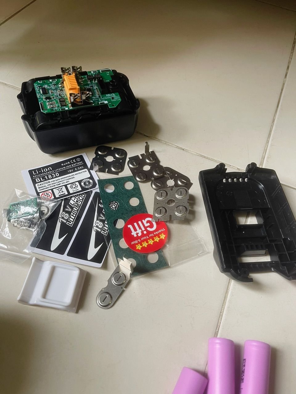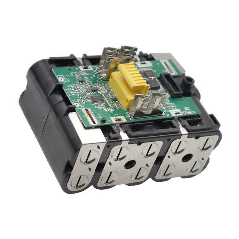 Replacement spare parts for Makita BL1830 6.0AH 18V Battery Pack, including outer battery box shell, BMS, battery holder, nickel strip, power indicator board, and screws.